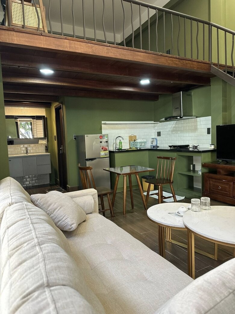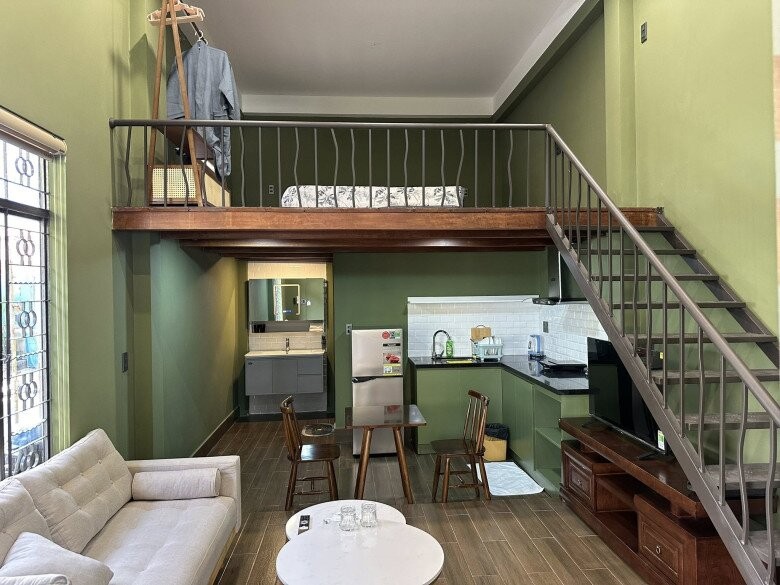 Ngôi nhà tại Đà Nẵng là một căn nhà nhỏ xinh gồm một tầng và một gác xép. Dù diện tích không lớn, không gian vẫn được bố trí đầy đủ công năng với sofa, bếp nấu, bàn ăn và các khu sinh hoạt cần thiết. Thúy Hà cho biết cô chủ động thiết kế phòng ở vừa đủ, nhường phần lớn diện tích cho sân vườn nhằm tạo cảm giác thoáng đãng, gần gũi với thiên nhiên. Phong cách sống tối giản, đề cao sự thư thái thể hiện rõ trong từng chi tiết bài trí.