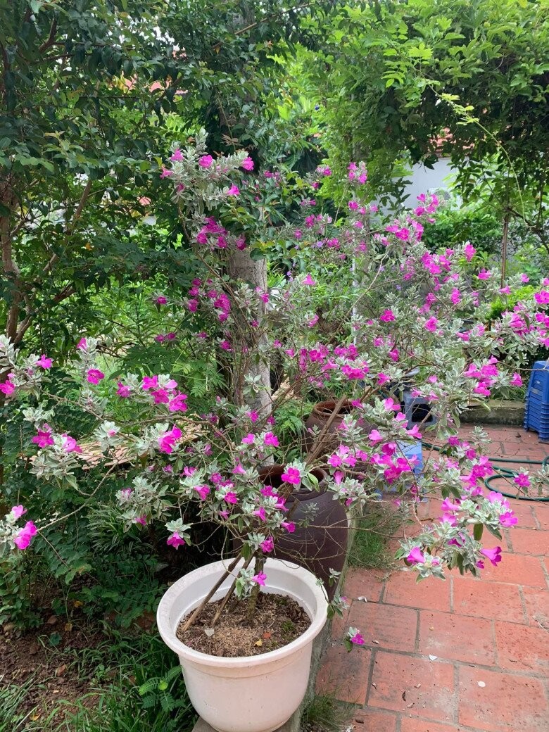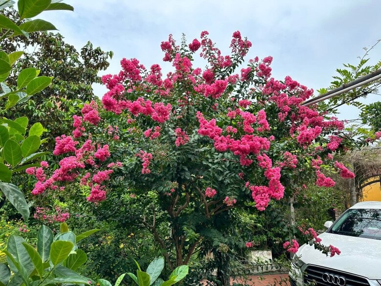 Cơ ngơi này ngập tràn sắc hoa. Thúy Hà ưu tiên chọn những loại hoa có sắc tím, hồng như chiều tím, tường vi, tuyết sơn phi hồng,... và cây nào cũng sai hoa.