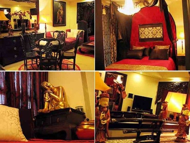 Căn biệt thự được thiết kế chủ đạo bởi 3 tone màu đỏ - đen – vàng theo phong cách Phật giáo. Trước nhà được đặt một bức tượng Phật có kích thước lớn.