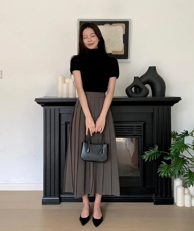 Chị em có thể chọn chân váy chữ A hoặc chân váy dáng dài nhẹ nhàng để tạo sự mềm mại cho tổng thể. Khi phối cùng sơ mi sáng màu, outfit vừa giữ được sự thanh lịch cần thiết, vừa mang lại vẻ ngoài tươi tắn, dễ chịu. Một mẹo nhỏ là nên sơ vin gọn gàng hoặc chọn sơ mi dáng ngắn để tạo hiệu ứng tôn dáng, giúp tổng thể trông cao ráo hơn. Đây là set đồ phù hợp cho những ngày cần sự chỉn chu nhưng không muốn quá gò bó.