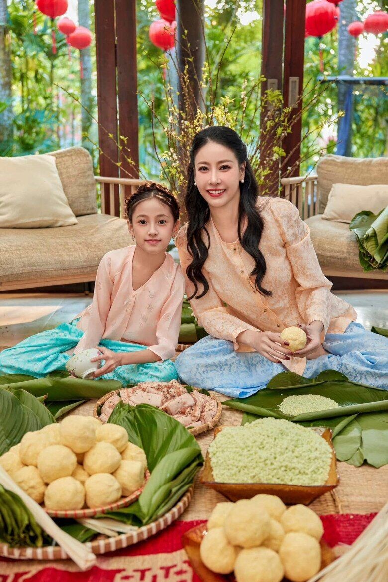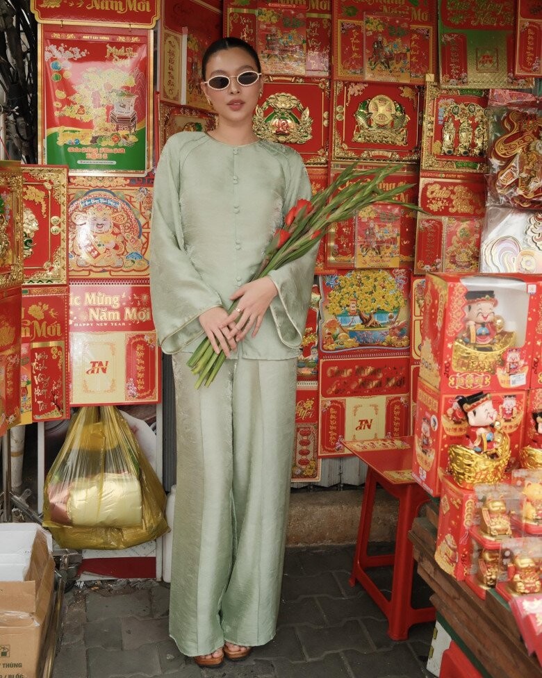 Gam xanh ngọc mát mắt cũng là lựa chọn đầy tinh tế cho dịp Tết. Áo bà ba dáng rộng, hàng nút vải cổ điển, tay loe nhẹ giúp tổng thể bay bổng, phù hợp với không khí Xuân. Khi kết hợp cùng túi cói và giày sandal, trang phục mang tinh thần nghỉ dưỡng, trẻ trung.