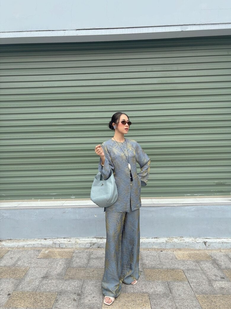 Một phiên bản áo bà ba hiện đại với dáng rộng, tay loe nhẹ, chất liệu gấm ánh kim màu xanh xám. Set đồ đồng bộ áo - quần tạo cảm giác phóng khoáng, thời thượng. Khi kết hợp cùng túi da tối giản, kính râm và trang sức bản nhỏ, áo bà ba bước ra khỏi khuôn khổ truyền thống để hòa mình vào nhịp sống đô thị.