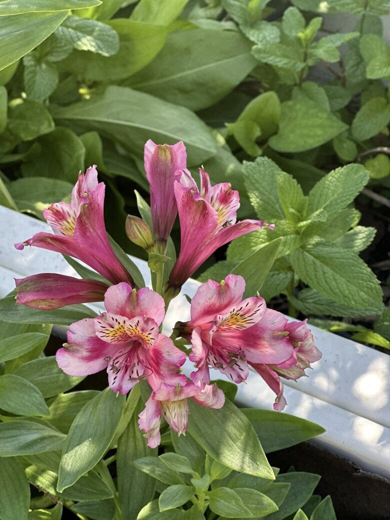 Một góc vườn khoe sắc hoa thủy tiên Mỹ với những sọc nâu đặc trưng trên cánh hoa, tạo nên vẻ đẹp hoang dại nhưng không kém phần tinh tế. Phía sau là những tán lá bạc hà xanh mướt, sự kết hợp giữa hoa cảnh và cây gia vị không chỉ làm đẹp không gian mà còn mang lại hương thơm tự nhiên, thư giãn.