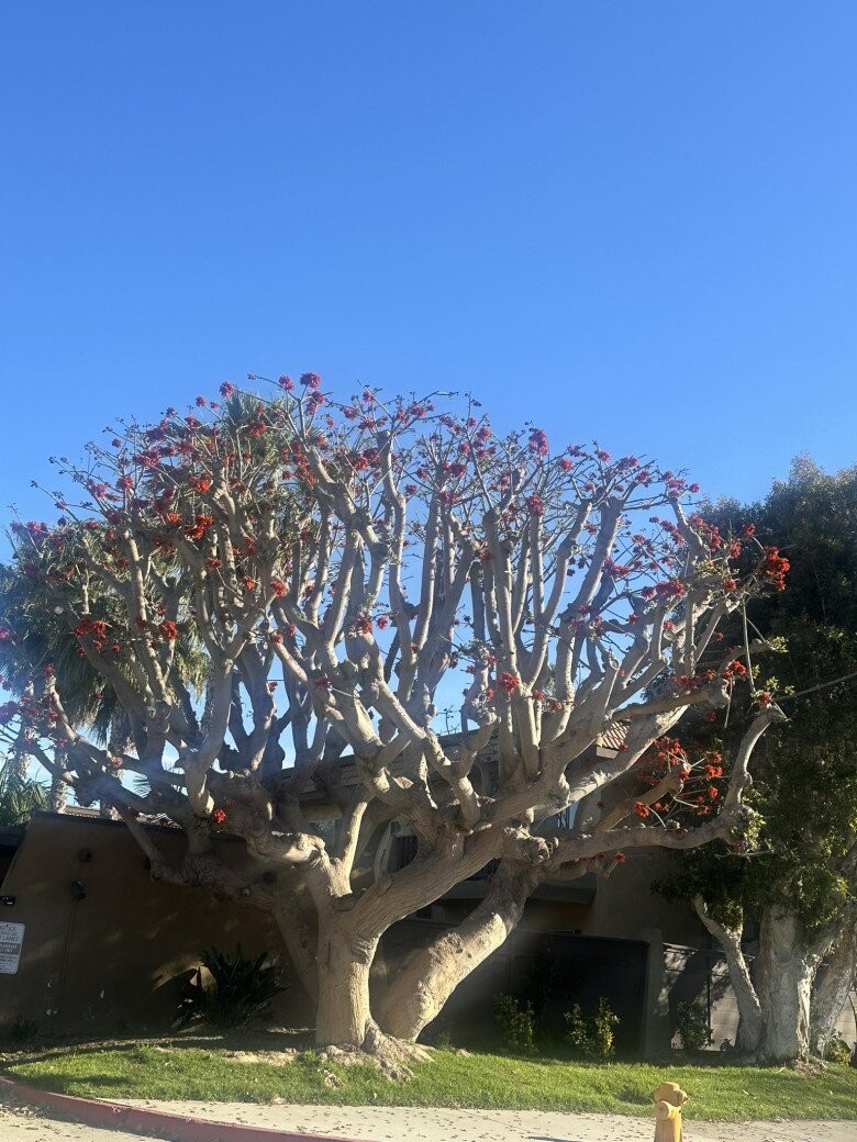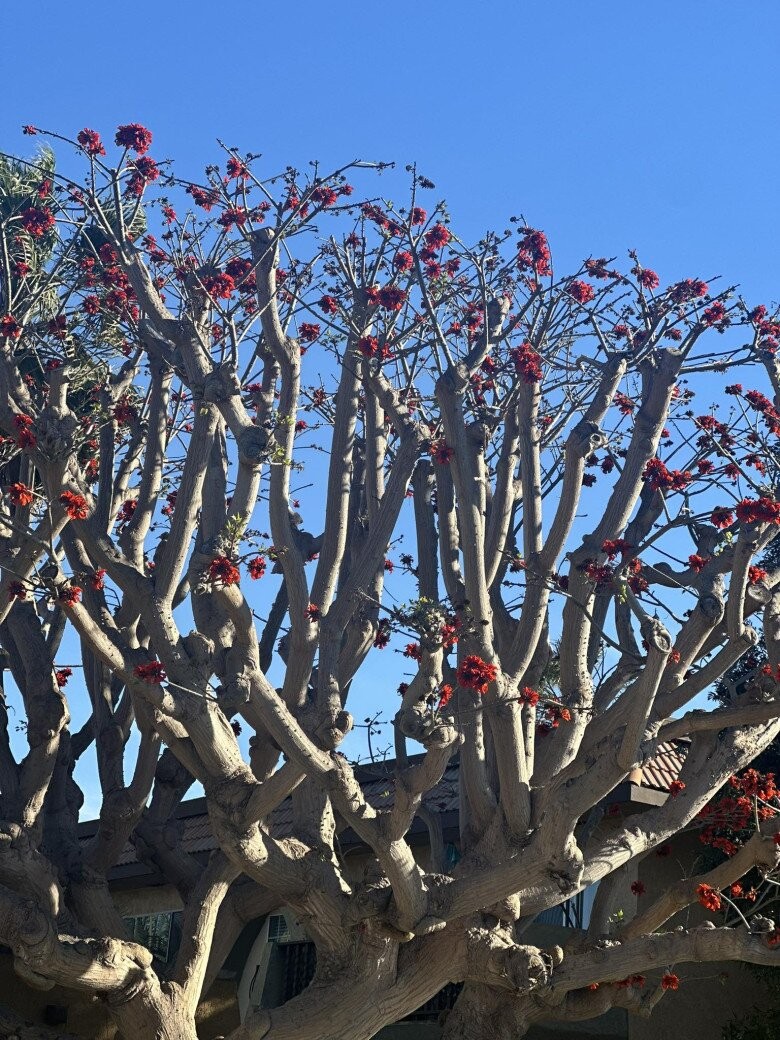 Đó là một cây san hô trần đang mùa thay lá để lộ những chùm hoa đỏ rực rỡ như những ngọn lửa trên bầu trời xanh. Sự kết hợp giữa những cành nhánh khẳng khiu và sắc đỏ nồng cháy tạo nên một vẻ đẹp kiến trúc tự nhiên độc đáo, khiến Vy Oanh không khỏi trầm trồ về sự "lạ lẫm" của thiên nhiên nơi đây.