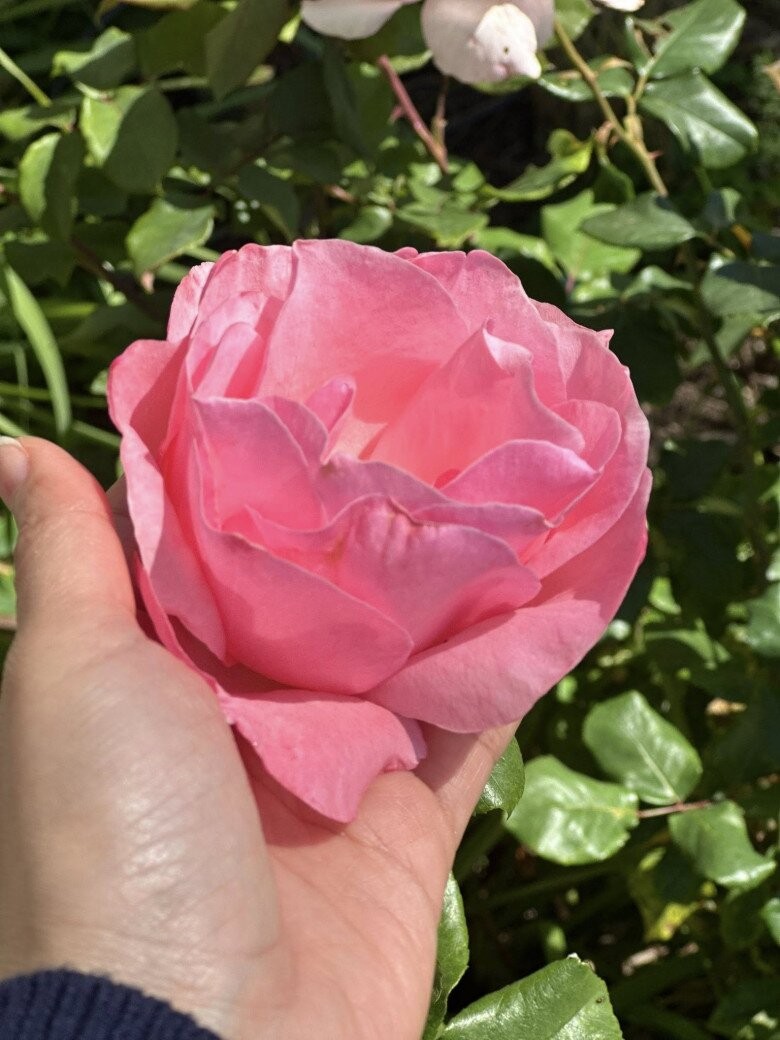 Giọng ca "Đồng xanh" khoe khéo một bông hoa hồng có kích thước lớn, cánh hoa xếp tầng mềm mại với sắc hồng phấn dịu nhẹ. Việc duy trì được những bông hồng to và đạt chuẩn về màu sắc tại Mỹ đòi hỏi kỹ thuật cắt tỉa và bón phân định kỳ, cho thấy sự đầu tư nghiêm túc của Vy Oanh cho thú vui điền viên.