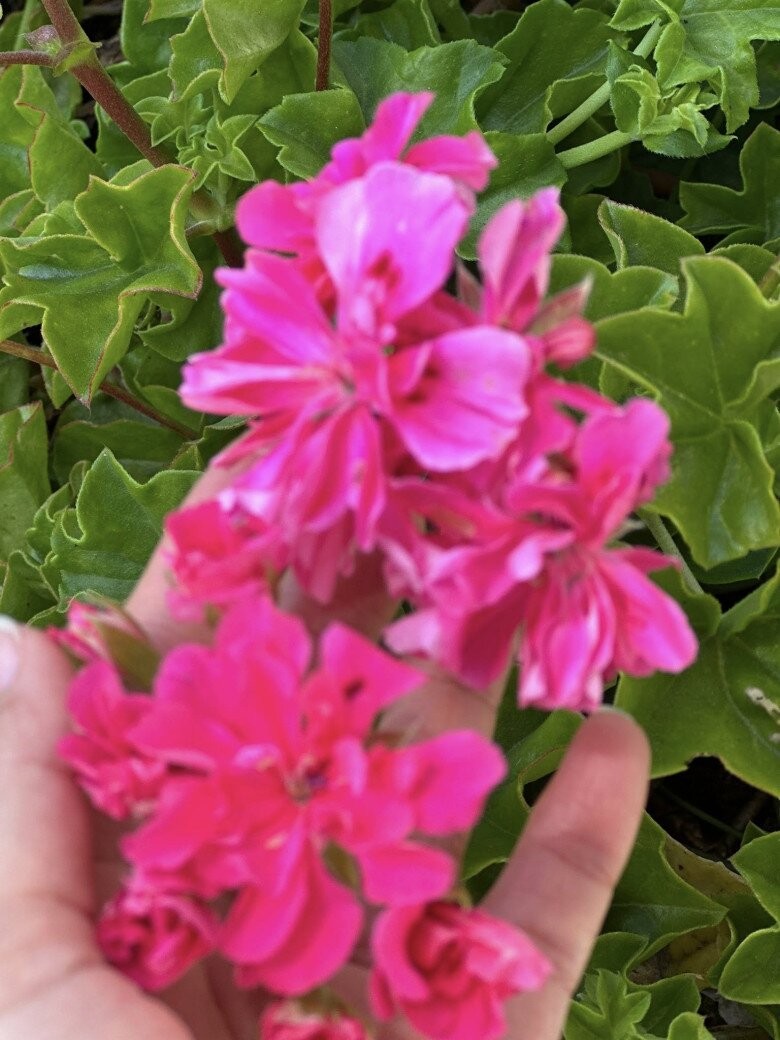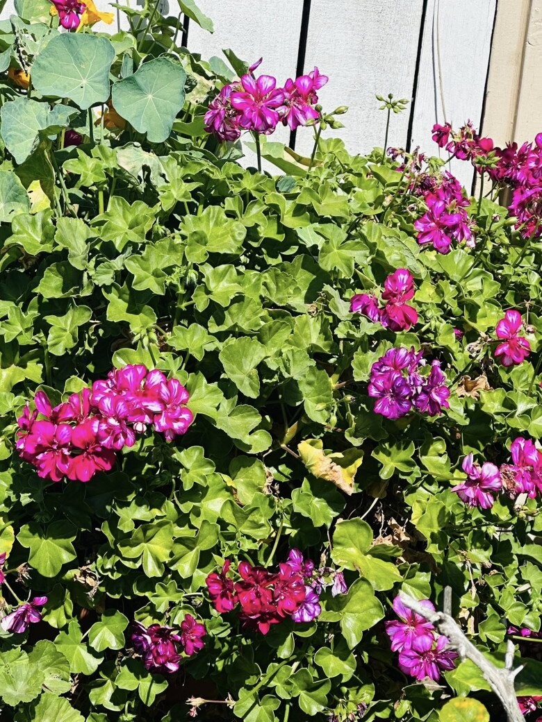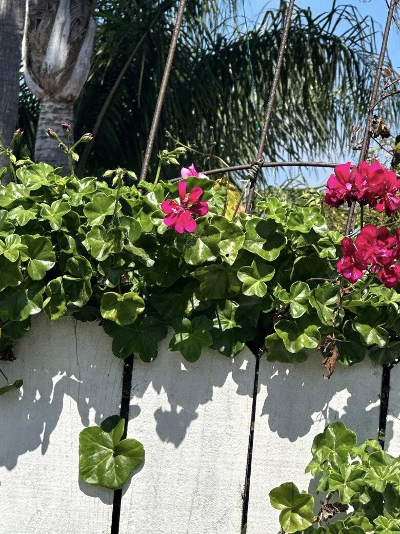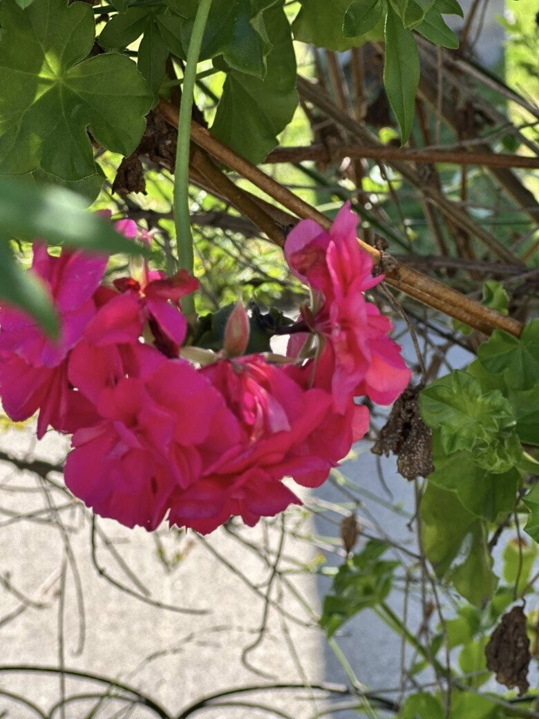 Cận cảnh những đóa hoa phong lữ thảo với sắc hồng đậm rực rỡ, một loài hoa phổ biến tại các vùng khí hậu ôn đới nhờ khả năng nở bền và chịu nắng tốt. Những cánh hoa mỏng manh đan xen tạo thành từng chùm tròn đầy, mang lại vẻ sinh động và cảm giác ấm áp cho không gian ngoại thất của ngôi nhà.