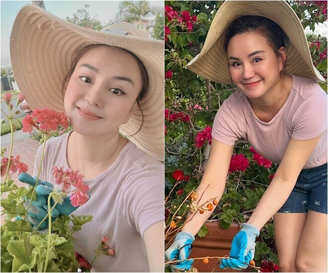 Vy Oanh hóa "nông dân" giản dị, chăm sóc cho vườn hoa của mình, cô bày tỏ: "Mấy hôm nắng quá, mấy em hơi tơi tả… chăm lại chút chắc sẽ xinh hơn".