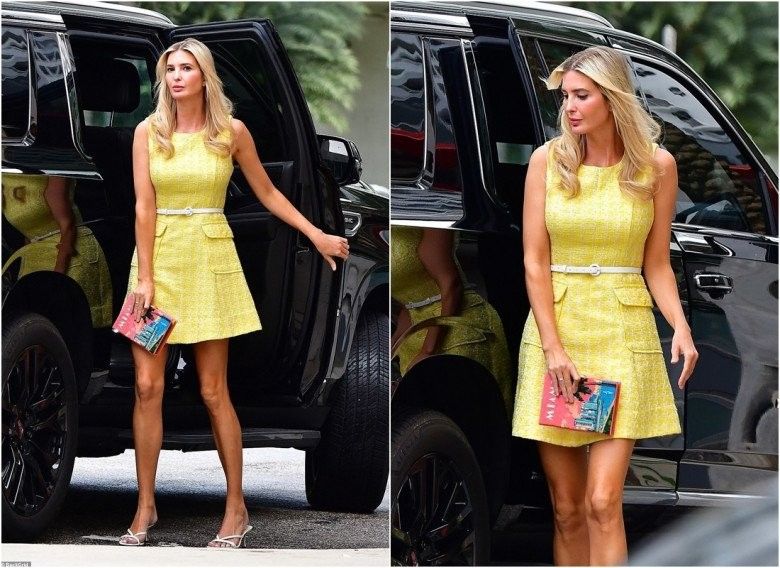 Chiếc váy tweed dáng chữ A sát nách mang sắc vàng rực được làm nổi bật phần eo bằng thắt lưng mỏng màu trắng giúp Ivanka trông yêu kiều và quyến rũ miễn chê. Để hợp với bộ váy, con gái của cựu Tổng thống Donald Trump chọn đi đôi sandals màu trắng đơn giản là đủ để tăng độ thanh thoát cho vẻ ngoài.