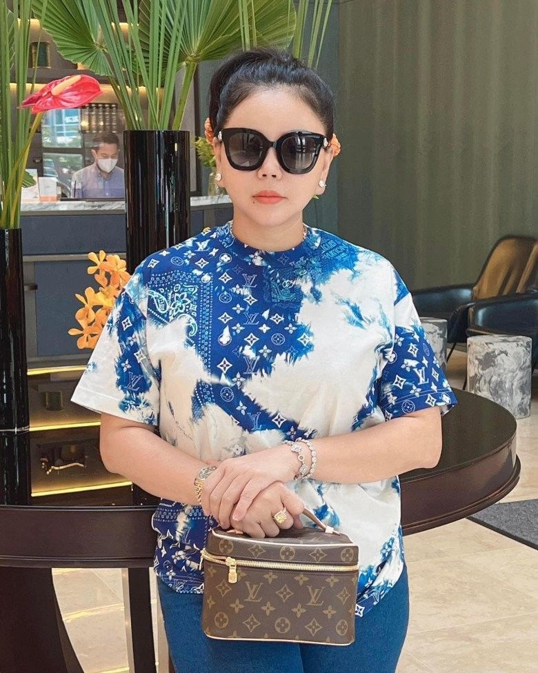 Mặc áo phông LV loang màu, Lê Giang cũng phối kèm mẫu túi Vanity cùng thương hiệu có giá ngót nghét trăm triệu đồng. Tuy tổng thể có phần rối mắt vì hoạ tiết và màu sắc chẳng mấy "ăn nhập" nhưng không phải ai cũng có khả năng sắm sửa ăn diện như nữ nghệ sĩ hài.