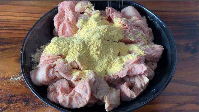2. "Massage" với bột ngô: Cho lòng vào chậu, thêm khoảng 2-3 thìa lớn bột ngô. Dùng tay bóp đều và kỹ. Lúc này, bột ngô sẽ bám chặt vào lớp nhầy, hút sạch bụi bẩn và giúp chúng bong ra cực nhanh. Bạn sẽ thấy việc làm sạch trở nên nhàn hạ hơn hẳn so với cách dùng muối truyền thống.