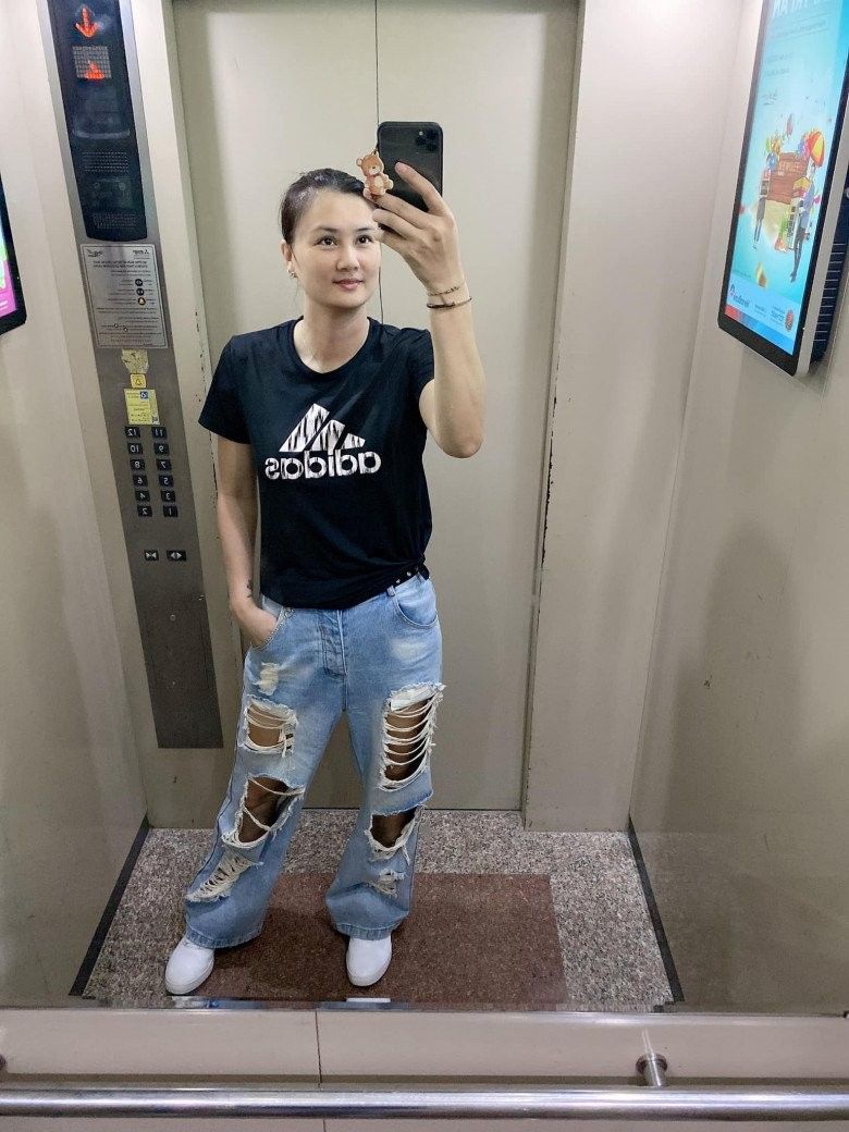 Bà mẹ 1 con diện thiết kế quần skinny jeans với phần quần cạp ngắn. Đây là item rất khó đối với phái nữ vì không phải ai cũng có vòng eo thon gọn hay vùng bụng dưới phẳng.