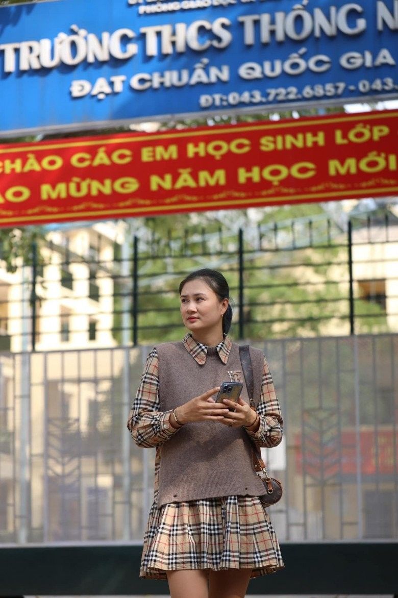 "Em chưa 18" là lời bình luận dí dỏm của nhiều fans khi trông thấy cô trưng diện set đồ này. Item mang hoạ tiết kẻ sọc đặc trưng của Burberry được mẹ 1 con phối cùng túi xách dáng ống đồng màu của Louis Vuitton.