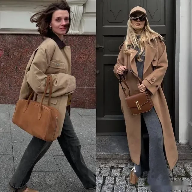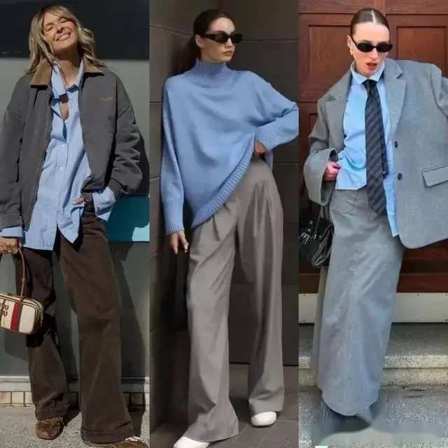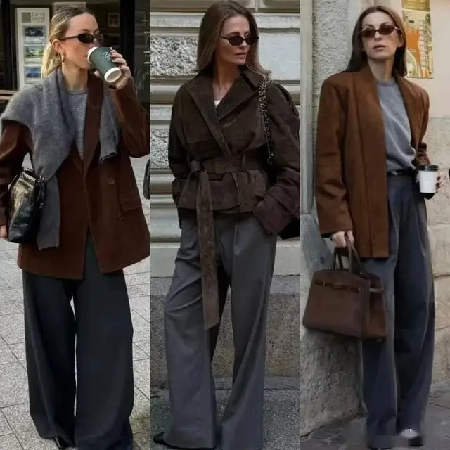Một chiếc áo khoác màu xám vốn đã toát lên nét thanh lịch và cao cấp. Khi phối cùng quần ống rộng màu nâu ấm, tổng thể trở nên mềm mại, gần gũi hơn mà vẫn giữ được phong thái thời thượng. Đây là cách phối lý tưởng để cân bằng sự lạnh của xám bằng hơi ấm tự nhiên của nâu.