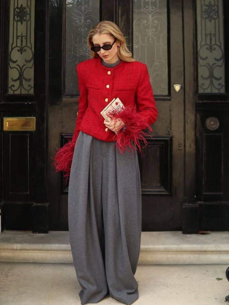 Với những dịp lễ hội như Tết Nguyên Đán, các sắc đỏ tươi hoặc đỏ cà chua mang đậm không khí rộn ràng, trang trọng. Khi kết hợp cùng màu xám, sắc đỏ được “tiết chế” lại, trở nên tinh tế và sang hơn. Ví dụ, áo khoác đỏ tươi phối với quần ống rộng màu xám giúp tổng thể toát lên khí chất tự tin, mạnh mẽ và đầy ấn tượng.