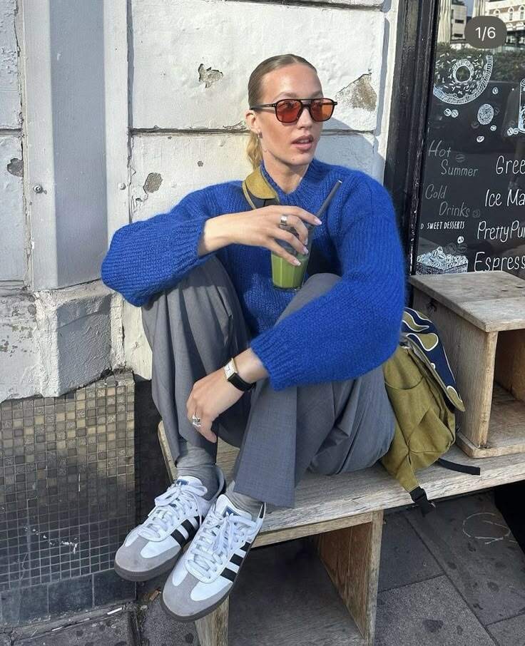 Với những ai yêu thích phong cách nổi bật, xanh Klein là gợi ý đáng thử. Đây là gam xanh lam có độ bão hòa cao, sắc độ thuần khiết, mang hơi thở hiện đại và tương lai. Khi đi cùng màu xám, xanh Klein tạo nên vẻ ngoài sáng sủa, sạch sẽ và đầy tính tiên phong. Một chiếc áo len xanh Klein phối với quần ống rộng xám trung bình không chỉ cá tính, mạnh mẽ mà còn có khả năng làm sáng da rất tốt, phù hợp cho nhiều hoàn cảnh khác nhau.