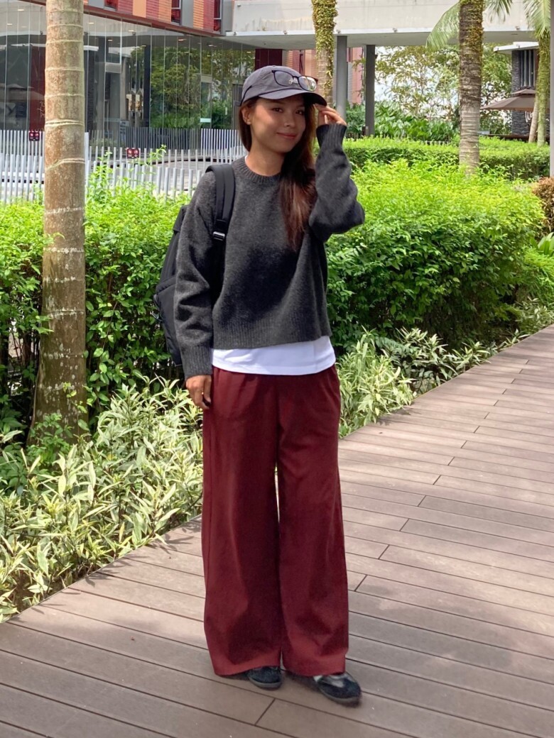 Một chiếc áo len đỏ tía tạo cảm giác thư thái, dịu dàng. Khi phối cùng chân váy kẻ caro màu xám, bộ trang phục trở nên nhẹ nhàng nhưng vẫn sinh động, vừa trẻ trung vừa năng động. Nếu bạn sở hữu áo khoác xám nhạt, hãy thử kết hợp với các món đồ đỏ tía – sự tương phản vừa đủ này sẽ mang lại vẻ ngoài ấm áp mà vẫn thanh lịch.
