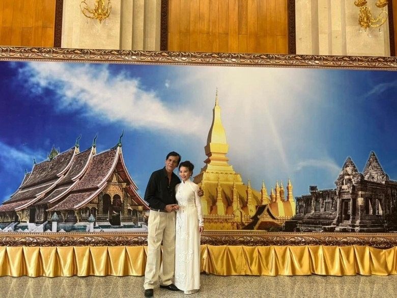 Mẹ Hồ Ngọc Hà vừa có chuyến công tác tại Lào, bà lựa chọn chiếc áo dài truyền thống màu trăng tinh khôi được đính đá lấp lánh thành hình những bông hoa sen, quốc hoa của Việt Nam.