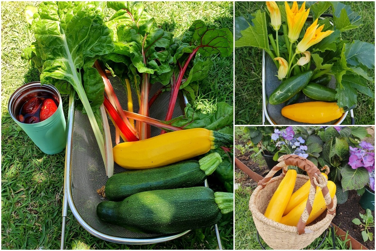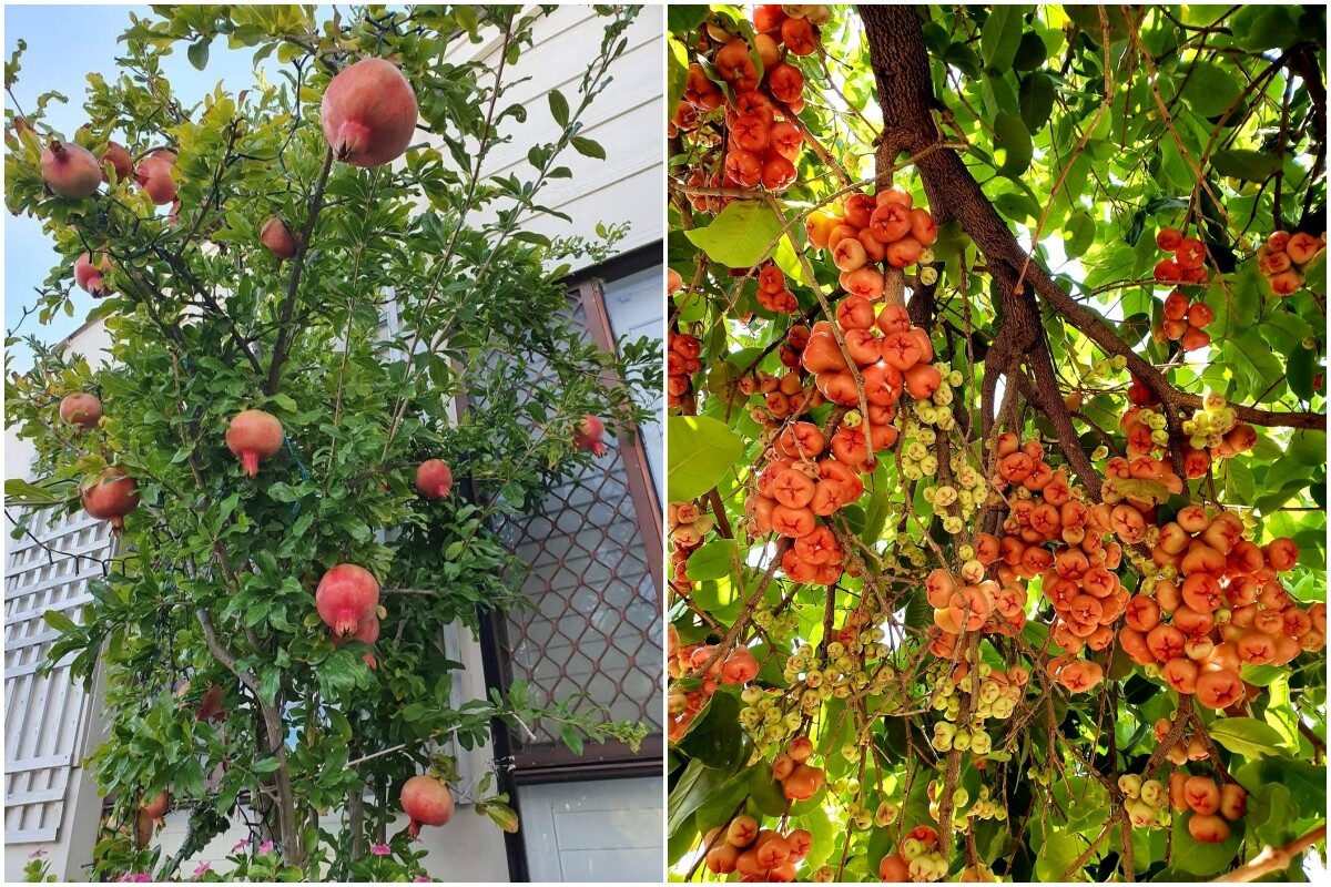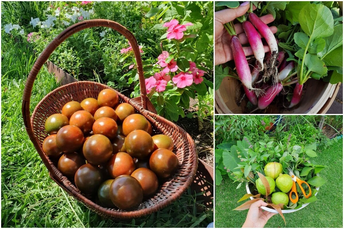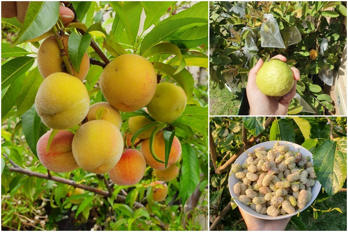 Trong khu vườn của mình, mẹ đảm Đà Nẵng trồng khá nhiều loại cây ăn quả như ổi, đào, quýt, lựu, oliu, dâu tằm trắng,... Ngoài ra còn có các loại rau theo mùa như xà lách, cà chua, bí ngồi, dưa leo… Mỗi mùa đi qua, khu vườn lại khoác lên một màu áo khác, mang đến cảm giác mới mẻ và đầy sức sống.