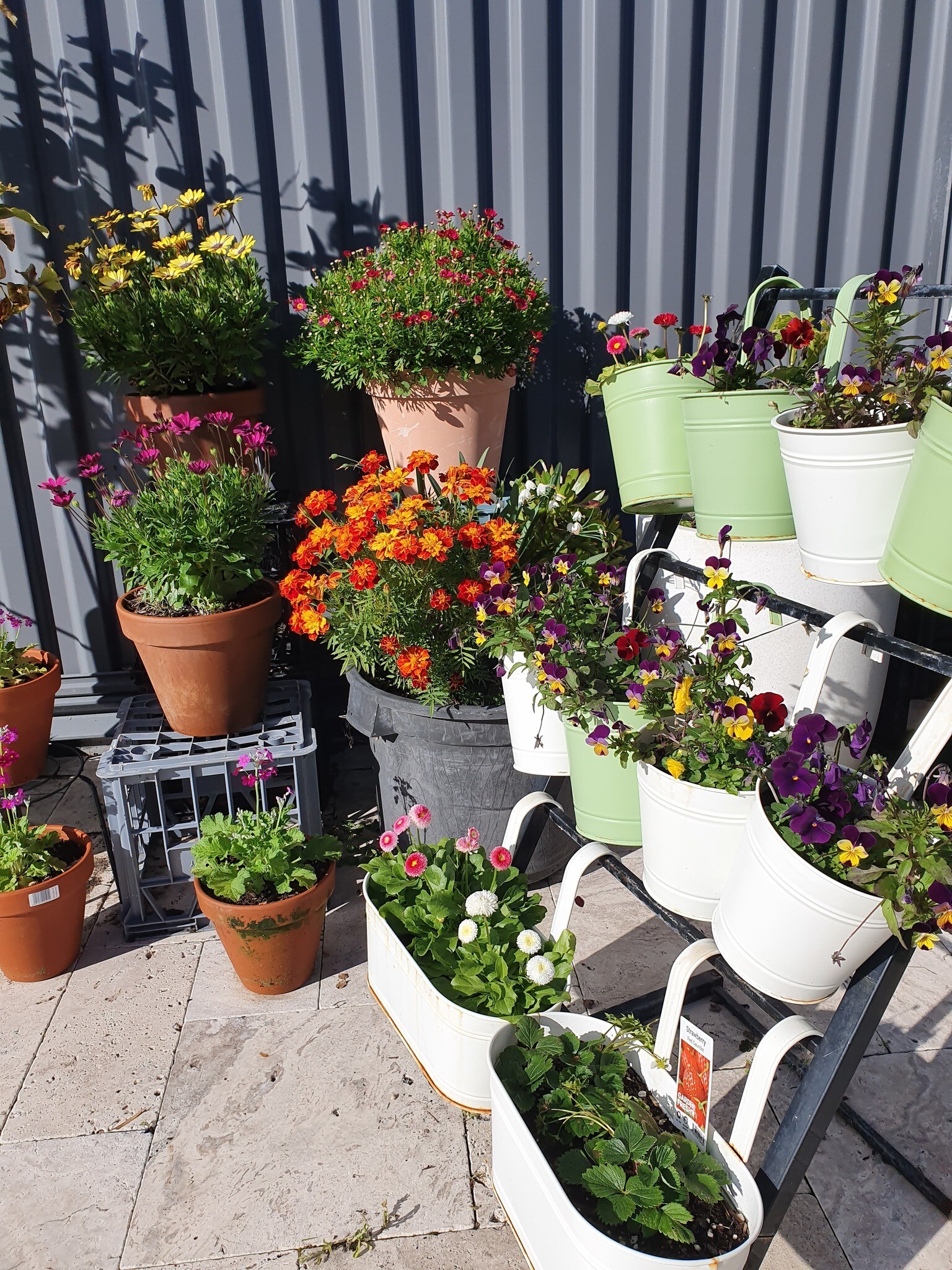 Một góc vườn nhà chị Hải An. Với những loại rau xanh, chị ưu tiên trồng trong chậu kệ cao.