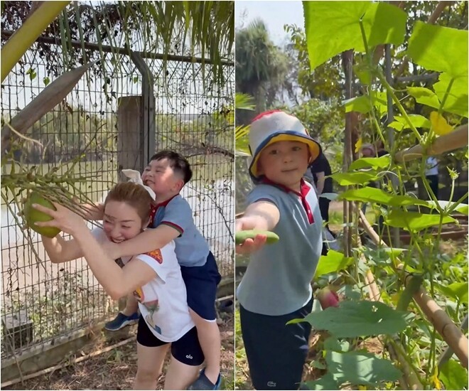 "Mấy ngày nghỉ lễ Chang cho 2 con vận động, tập làm vườn và hít thở ít oxy tươi. Chủ đích cũng muốn dạy con biết trân quý lao động. Các cô xem bác nông dân Gia Khang hái được những trái gì nè?", người đẹp bày tỏ.