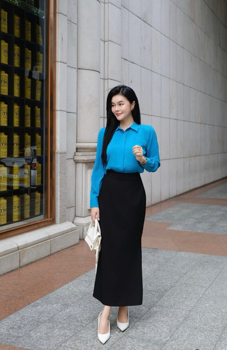 Sự kết hợp này là phiên bản “nâng cấp” của bộ suit truyền thống. Khi thay quần tây bằng váy đen dáng suông dài, tổng thể trở nên nữ tính và mềm mại hơn nhưng vẫn giữ được sự chỉn chu. Nên chọn blazer phom rộng nhẹ, layer cùng áo phông trắng để tạo cảm giác thoải mái, cân bằng giữa tính trang trọng và nét trẻ trung.
