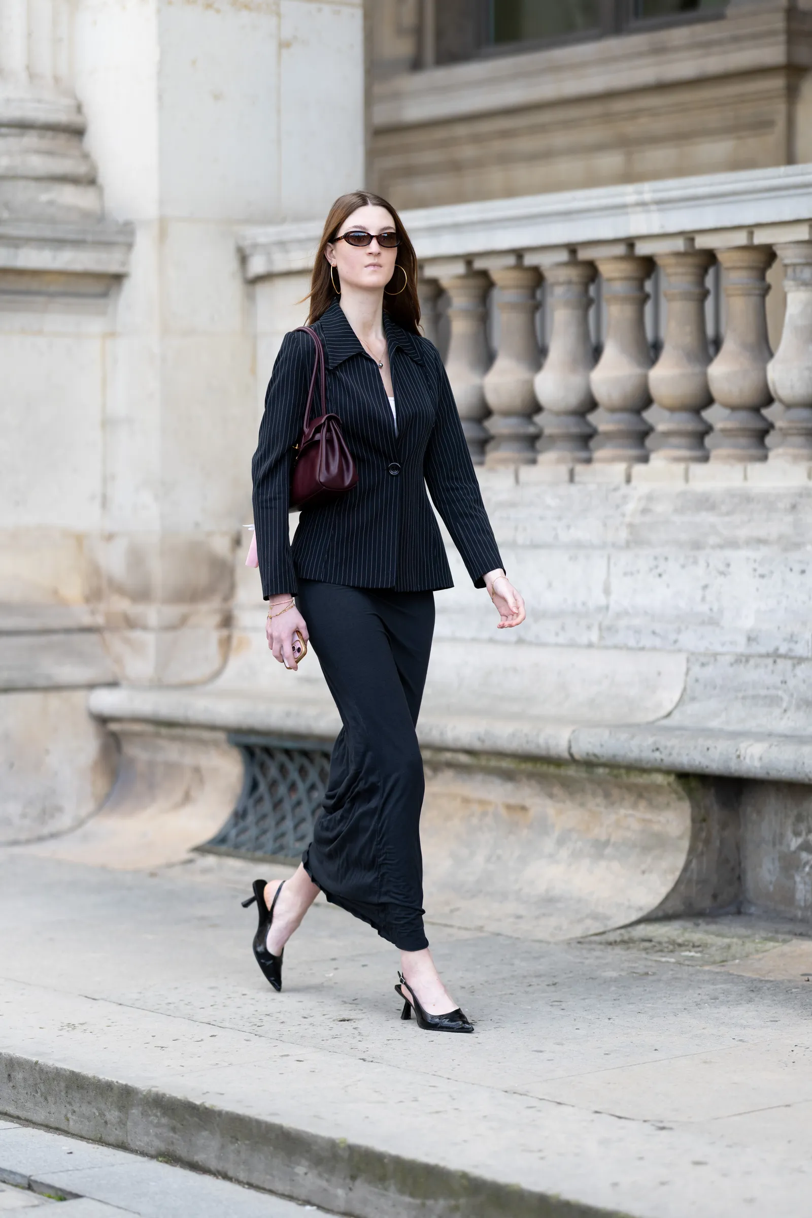 1. Váy đen dáng suông dài + blazer kẻ sọc: Thanh lịch, hiện đại nơi công sở