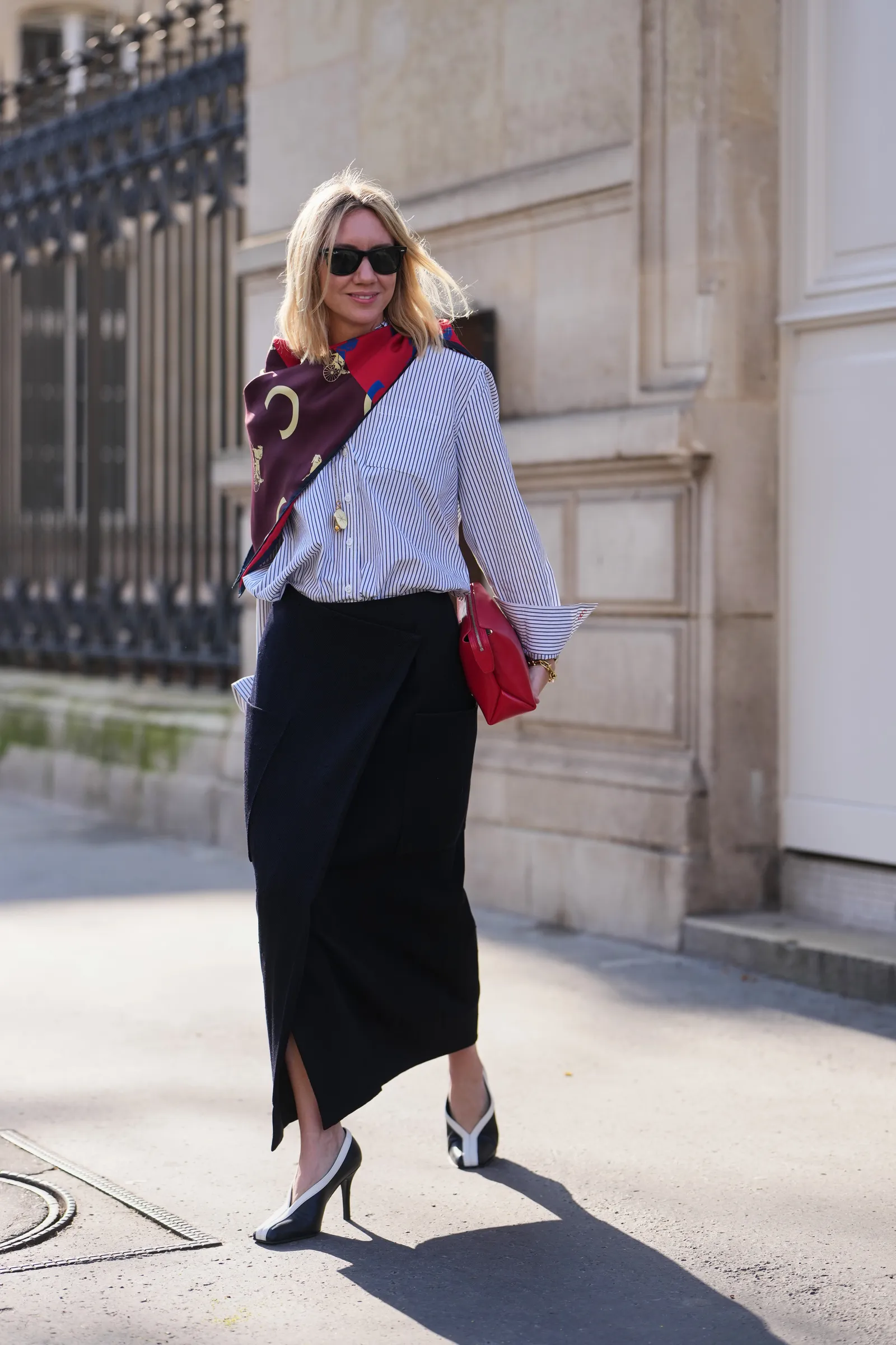 2. Váy đen dáng suông dài + điểm nhấn đỏ: Nổi bật mà vẫn tinh tế