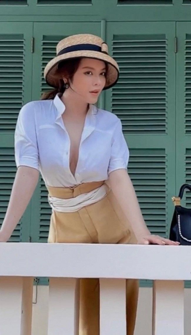 Ở một khoảnh khắc khác, mỹ nhân Vũng Tàu đã cởi nhẹ chiếc áo và dùng tay ôm ngực trần. Đường cong hình thể của Lý Nhã Kỳ vì thế cũng được phô diễn triệt để.