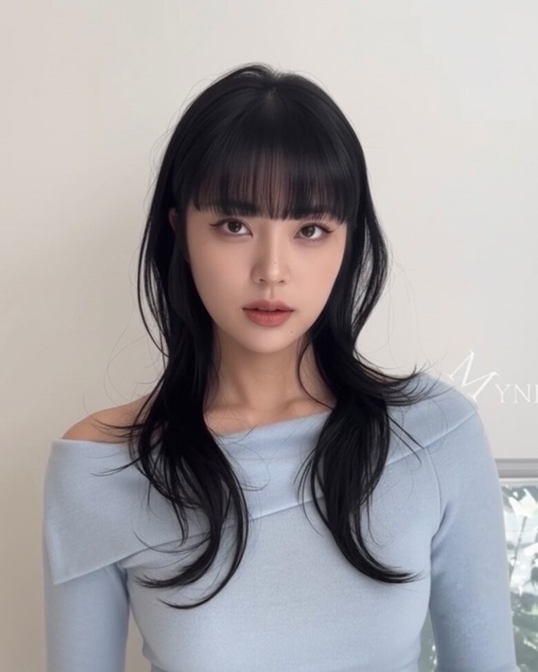 Nếu bạn không muốn kiểu tóc quá cầu kỳ, sự kết hợp giữa mái bằng và Wooden Horse Curl là lựa chọn đáng thử. Phần mái thẳng với đường cắt gọn gàng tạo điểm nhấn rõ nét, trong khi các lọn xoăn phía dưới lại mềm mại, bồng bềnh tạo nên sự tương phản thú vị mà vẫn hài hòa.
