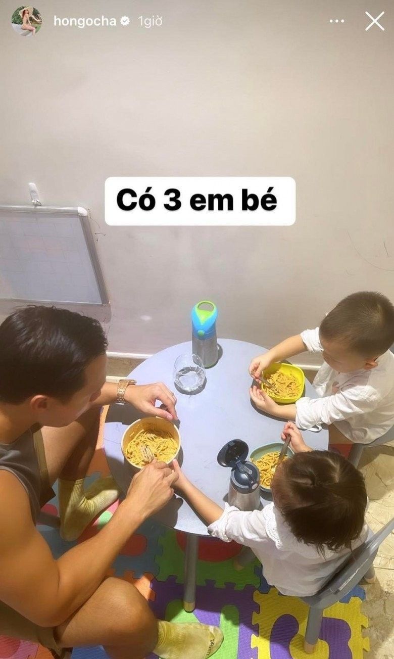 Khung cảnh ấm áp như vừa cùng ăn vừa cùng chơi, vừa cùng dạy dỗ các con của nam diễn viên Hương ga cũng khiến bà xã Hồ Ngọc Hà cảm thấy ấm áp. Bà mẹ 3 con hạnh phúc khi thấy người chồng của mình như biến thành một em bé để dịu dàng ở bên các con. "Có 3 em bé" - giọng ca Cả một trời thương nhớ viết.
