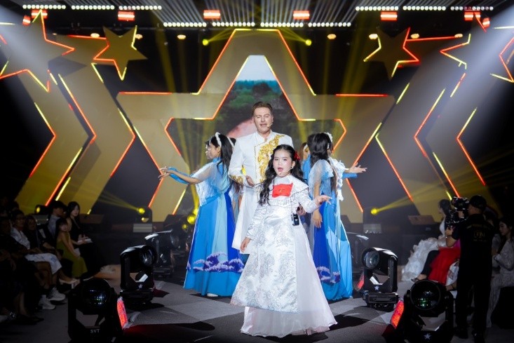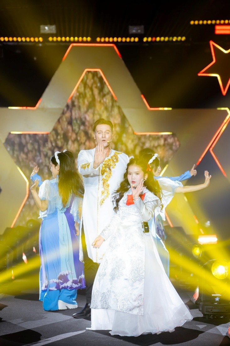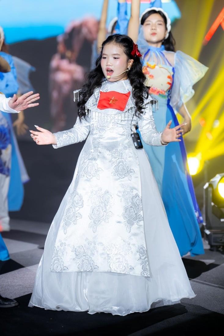 Phong thái biểu diễn tự nhiên cùng giọng hát sáng của nữ ca sĩ nhí giúp tiết mục mở màn tạo ra không khí trang trọng và tích cực cho toàn bộ sự kiện.