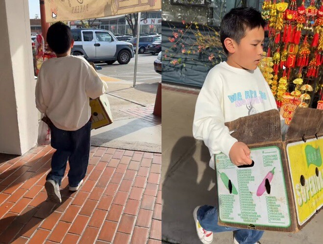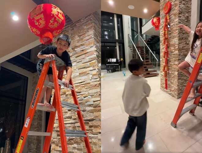 Thấy cầu thang cao, cậu nhóc không ngại trèo lên để treo lồng đèn giúp mẹ. Đi mua đồ Tết, thấy thùng nặng quá cũng cố gắng bưng phụ cho mẹ về tới tiệm. Những việc nhỏ thôi nhưng đủ làm lòng mẹ ấm lạ.