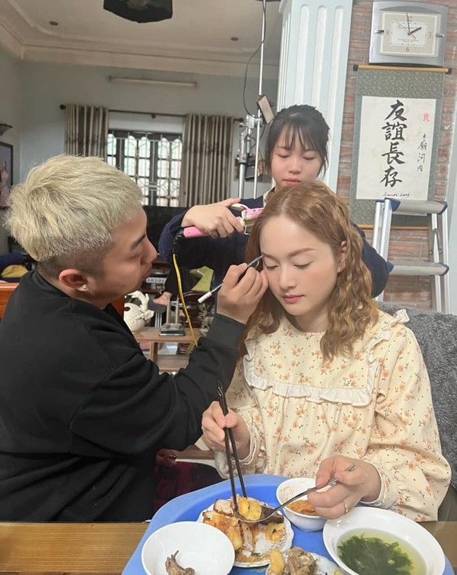 Sau dịp nghỉ Tết Nguyên đán, đoàn làm phim đã khởi động lại. Hiện tại, ekip Nhà Có Ba Nàng Dâu vẫn tiếp tục gấp rút thực hiện các cảnh quay để kịp cho thời điểm lên sóng. Mới đây nhất trên trang cá nhân, nữ diễn viên Lan Phương đăng tải một bức ảnh hậu trường cho thấy cô đang tranh thủ ăn ngay khi trang điểm. Người đẹp viết dòng chú thích dí dỏm: "Thời gian thì ít mà việc thì nhiều nên bữa ăn đoàn phim kiểu… (mếu máo)".