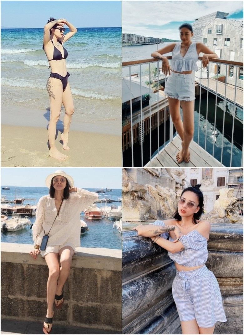 Ngoài ra, nữ diễn viên còn ăn mặc phóng khoáng và gợi cảm hơn thấy rõ. Từ quần short, áo tanktop, bikini... những món trang phục này không chỉ giúp bà xã Huy Trần khoe trọn hình thể nuột nà mà còn giúp cô "hack tuổi" đáng nể.