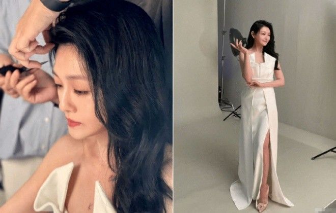 Nữ diễn viên đang chụp hình quảng cáo cho một nhãn hàng.
