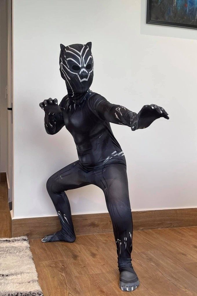 Bé Andy - quý tử Thu Trang và Tiến Luật - yêu thích nhân vật Black Panther trong loạt phim siêu anh hùng của Marvel nên được bố mẹ đầu tư cho một bộ trang phục rất ngầu.