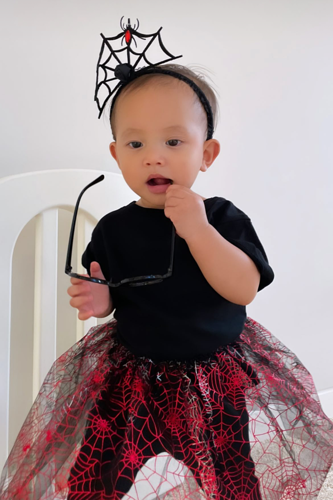 Con gái Hồ Ngọc Hà - Kim Lý cũng đã có một mùa Halloween đầu đời quậy tới bến với trang phục nhện đỏ.