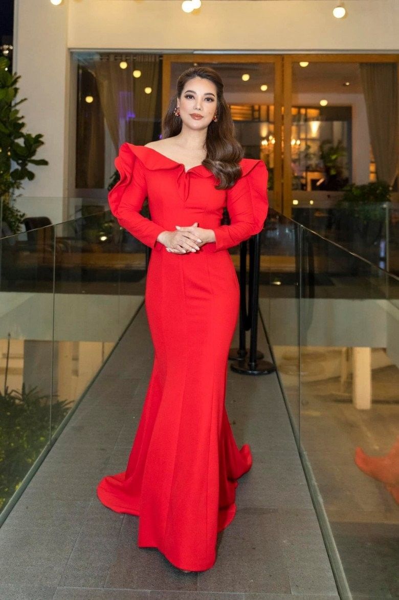 Vốn có nhược điểm và bờ vai thô và bắp tay khá mũm mĩm nhưng bù lại sở hữu chiếc eo nhỏ nhắn, Trương Ngọc Ánh khéo chọn trang phục trễ vai, ôm nhẹ vòng 2 là đủ khoe được triệt để thân hình đồng hồ cát quyến rũ. Sắc đỏ rực của trang phục cũng giúp bà mẹ một con thêm nổi bật và trẻ trung.