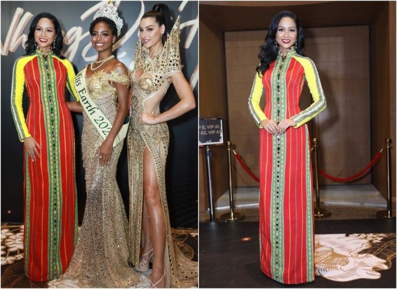 Đó là bởi dù H'Hen Niê ăn mặc kín đáo, nhưng bộ áo dài của nàng Hậu lại là sự kết hợp của các mảng sắc màu vô cùng nổi bật và hút mắt. Do đó mà đứng cạnh 2 Hoa hậu Trái Đất ăn mặc lộng lẫy hết cỡ, H'Hen Niê không hề bị chìm nghỉm.