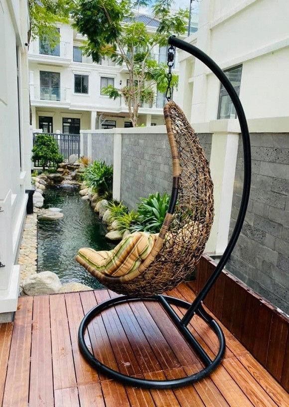 Điểm nhấn của căn biệt thự là hồ cá Koi, xung quanh đặt đá và trồng thêm cây cảnh. Bao quanh hàng rào nhà Vân Hugo là nhiều loại hồng với đủ màu sắc khác nhau từ hồng nhung, hồng vàng, hồng đỏ, hồng phai...