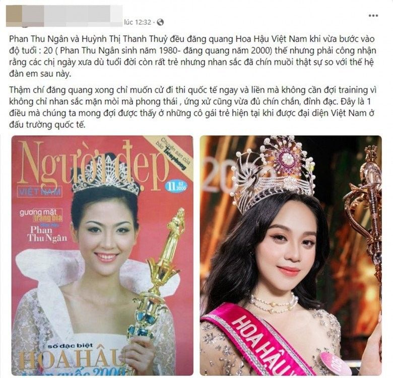 Bài đăng so sánh nhan sắc của Thu Ngân ở tuổi 20 và cho rằng. Lúc này, chân dài đăng quang với nhan sắc mặn mà, phong thái, ứng xử chín chắn, đĩnh đạc và chỉ như chờ để được tấm vé đi thi quốc tế. Đây có lẽ là điều mà chúng ta mong đợi được thấy ở những cô gái trẻ hiện tại khi được đại diện Việt Nam ở đấu trường quốc tế.