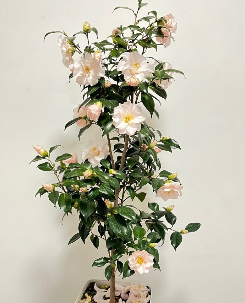Vũ y có nguồn gốc từ Nhật Bản, thuộc nhóm hoa trà cỡ nhỏ đến trung bình. Cây sinh trưởng vừa phải, trồng xuống đất cũng chỉ cao khoảng 2 mét. Nhờ khả năng phân cành tốt, tán cây gọn gàng và dáng cây đầy đặn, giống này đặc biệt phù hợp trồng chậu.