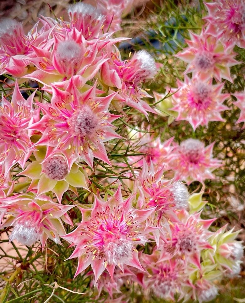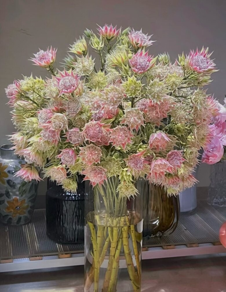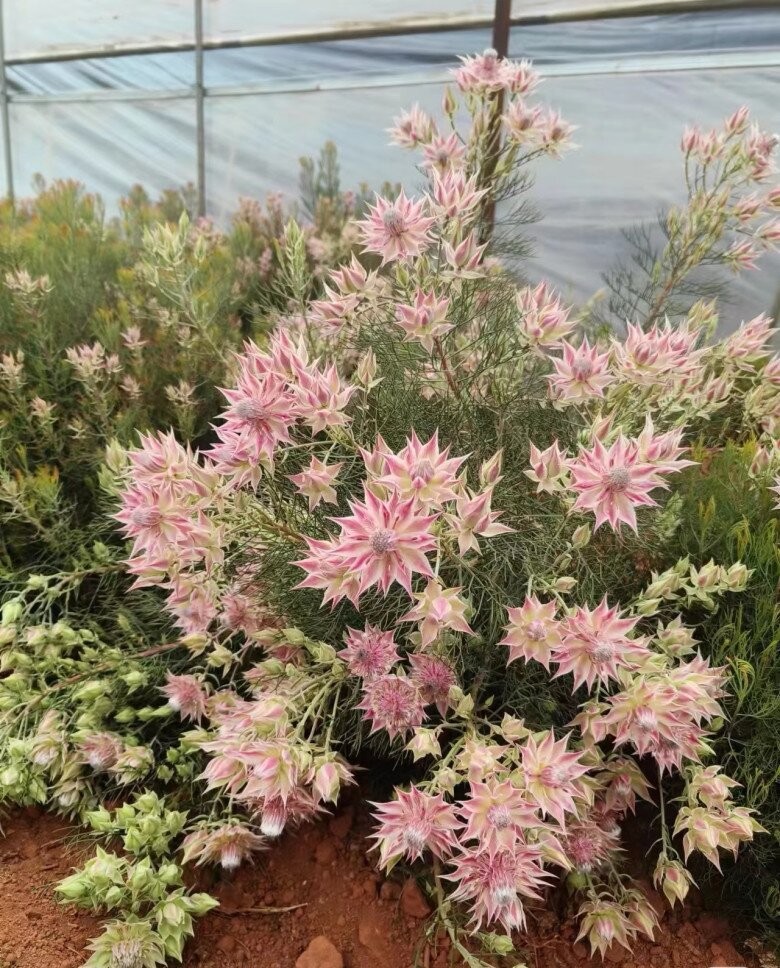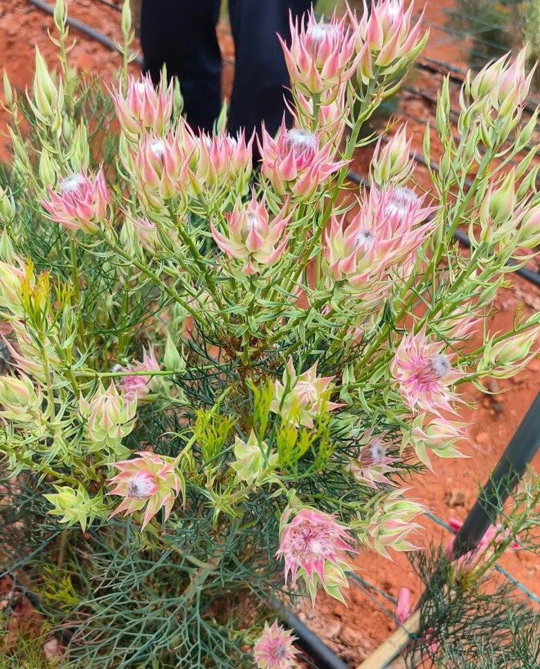 Hoa cô dâu đỏ mặt có nguồn gốc từ Nam Phi, chủ yếu phân bố ở Nam bán cầu. Nó thuộc cùng họ với hoa Đế vương (Protea) và Banksia. Tại quê hương bản địa, loài hoa này thường được dùng làm hoa cầm tay cho cô dâu vì loại hoa này tượng trưng cho sự gắn bó bền lâu, tình yêu lãng mạn và vĩnh cửu. Đồng thời, nó cũng là một chất liệu hoa khô rất được ưa chuộng.