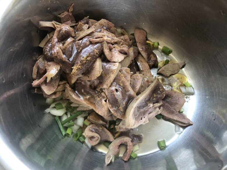 Gan heo rửa bằng nước ấm, loại bỏ máu và tạp chất, để ráo rồi thái lát. Có thời gian, các bạn hãy ngâm gan đã thái trong nước để ra bớt máu thừa cho đỡ tanh. Sau đó cho thêm rượu nấu ăn và tinh bột, trộn đều, để ướp.