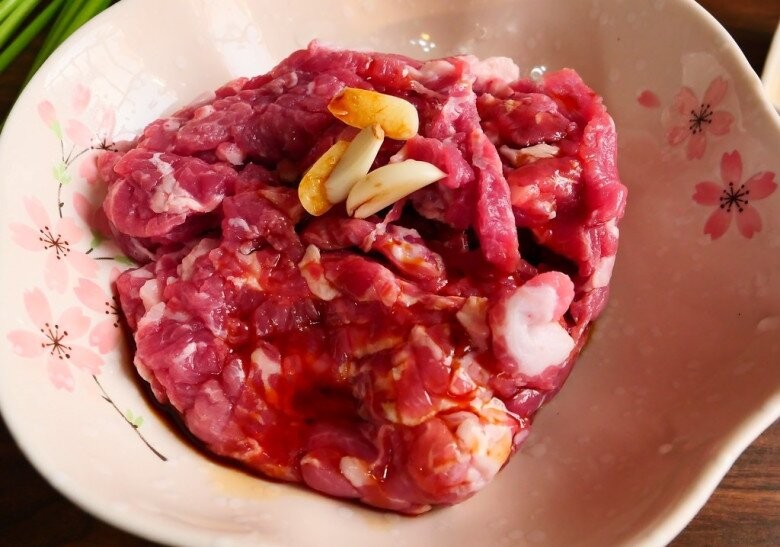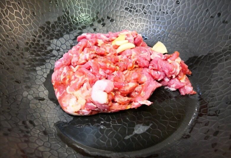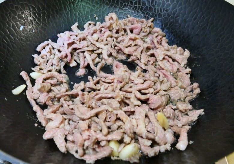 Do thịt vai có sẵn mỡ nên không cần thêm dầu. Cho thịt đã ướp vào chảo, xào ở lửa vừa đến khi thịt chín và đổi màu.