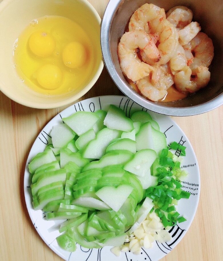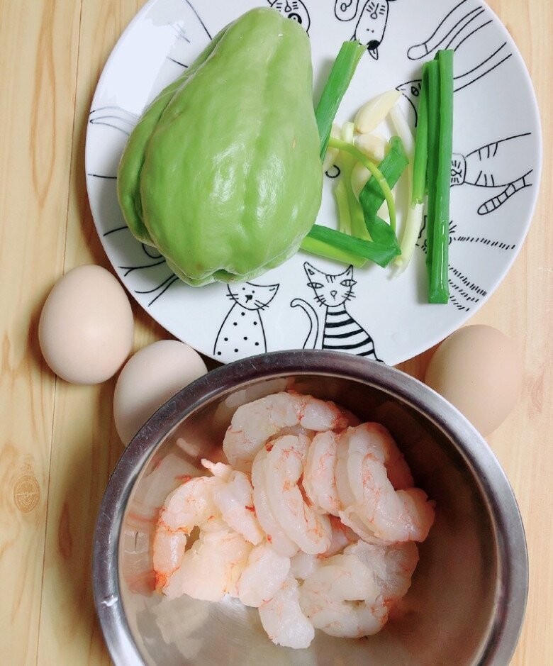 - Su su: 1 quả - Tôm bóc vỏ: 200g - Trứng gà: 3 quả - Hành lá: 2 cây - Tỏi: 3 tép.