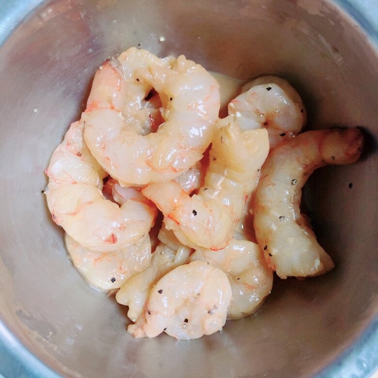 Cho tôm vào tô, thêm muối, rượu nấu ăn, xì dầu, dầu hào, bột năng và tiêu đen. Trộn đều, ướp khoảng 5 phút cho thấm gia vị.
