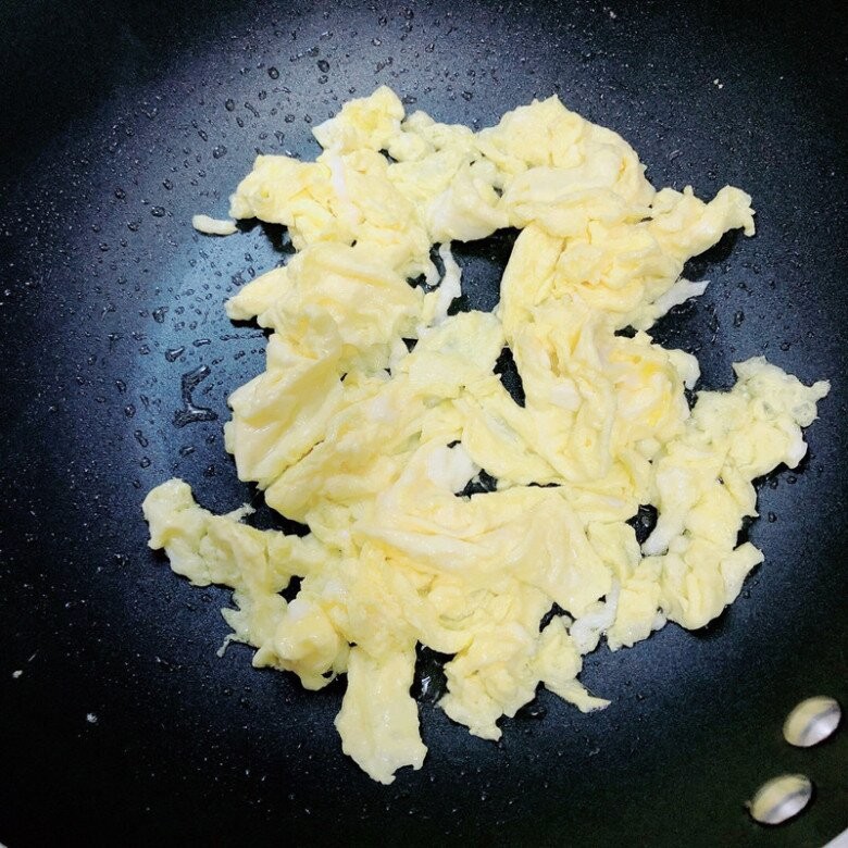 Đun nóng chảo với một ít dầu, cho trứng vào xào nhanh tay đến khi vừa chín thì trút ra đĩa, để riêng.