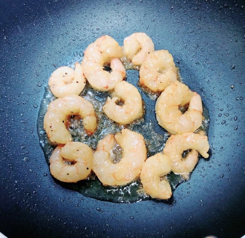 Cho thêm dầu vào chảo, đun nóng vừa. Cho tôm vào áp chảo lửa nhỏ đến khi tôm săn và hơi vàng mặt.