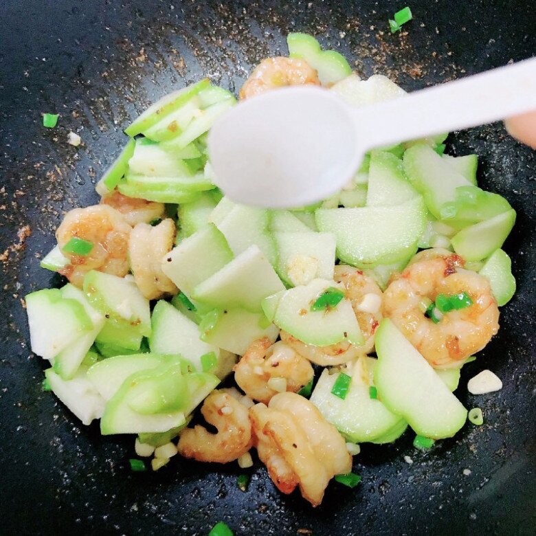 Cho tỏi và hành vào đảo thơm, tiếp đó cho su su vào xào đều. Nêm thêm chút muối cho vừa ăn.